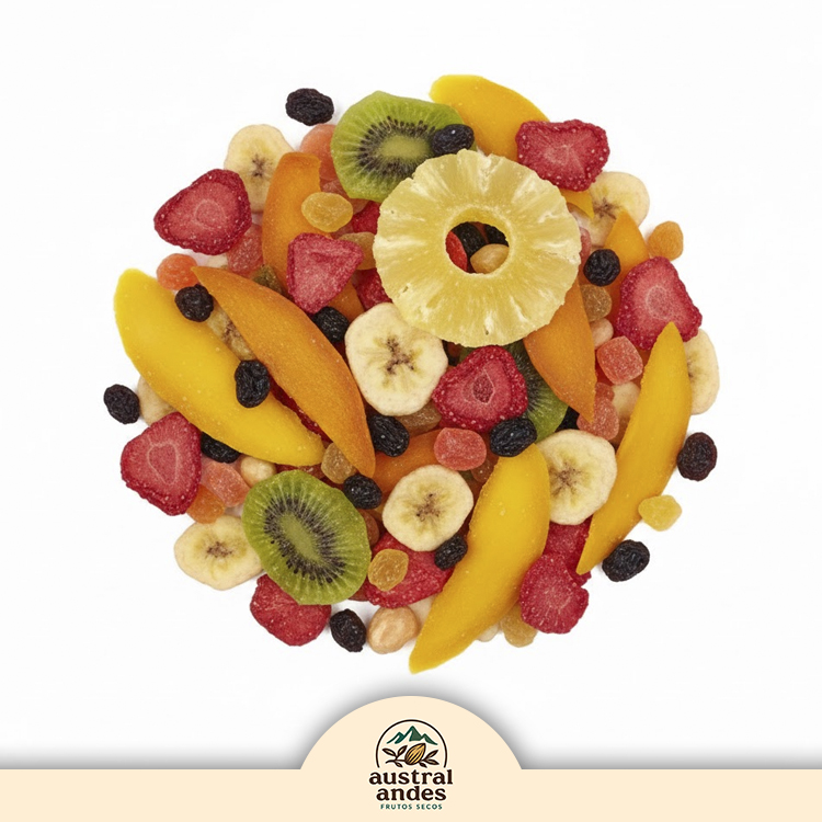 Una explosión de color, sabor y energía natural. Nuestro Mix de Frutas Deshidratadas Austral Andes reúne una cuidadosa selección de frutas del sur y del valle, deshidratadas suavemente para conservar todo su sabor, aroma y nutrientes.